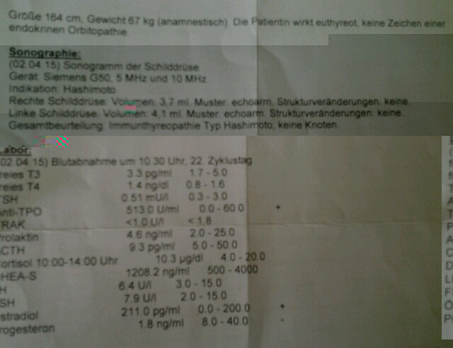 Ich habe SD-Unterfunktion und Hashi, bin aber laut Endo gut eingestellt.Anbei die Werte vom April diesen Jahres, nehme täglich 100er -L-Thyroxin.